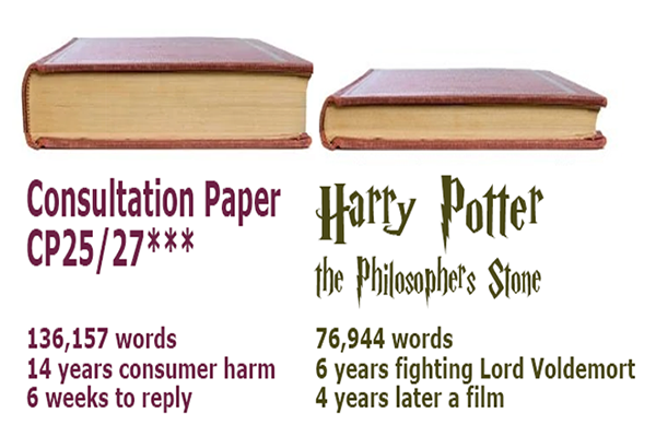 Today the same regulator published a consultation that is twice as long as the first Harry Potter book. Giving just 6 weeks for comment.